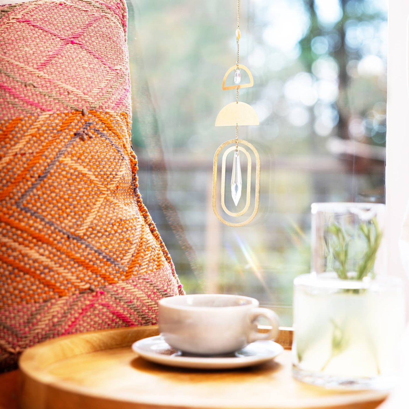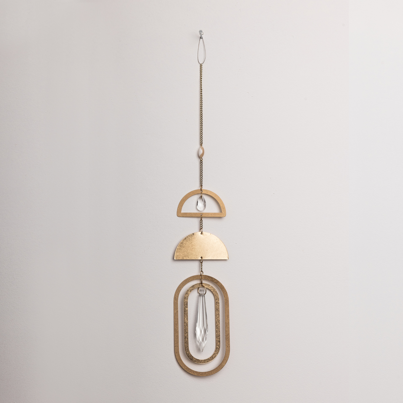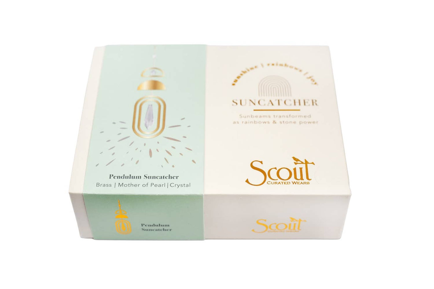SUNSHINE | RAINBOWS | JOY Elevate your space with a crystal suncatcher that turns light into magical rainbows. Each piece is crafted from gold plated brass, features a semi-precious stone and includes a suction cup to attach to a sunny window. Our suncatcher boxes are thoughtfully designed & ready to gift. •Gold plated brass, glass crystal, semi-precious stone •Includes canvas storage bag & suction cup with a metal hook •Dimensions: 12.5" long •For indoor use only •Recommended to be displayed on the D09 Mother Of Pearl | Stone of Prosperity