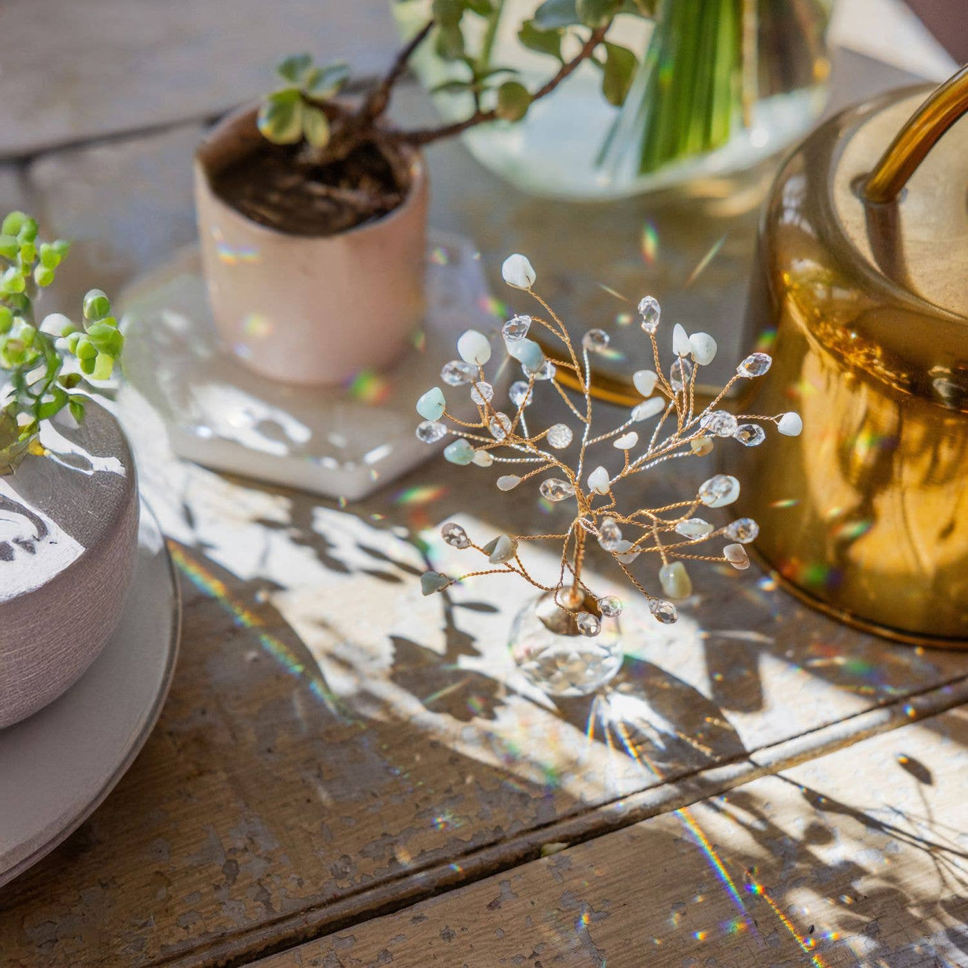 SUNSHINE | RAINBOWS | JOY Elevate your space with a crystal suncatcher tree that turns light into magical rainbows. Place in any sunny spot to cast sparkling rainbows that fill the space with joy and wonder. Each piece is crafted from gold plated brass, features a semi-precious stone and includes a suction cup to attach to a sunny window. Our suncatcher boxes are thoughtfully designed & ready to gift. • Glass crystal base, semi-precious stones & crystal accents • Includes canvas storage bag • Dimensions: Height 5", Crystal base: 1.25" x 1.25" • For indoor use only • Recommended to be displayed on the D09 Amazonite | Stone of Courage *Please Note: Each item is hand crafted using natural materials, so slight variations in color and size add to the distinctive beauty of each piece.